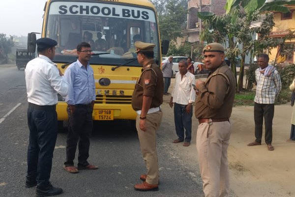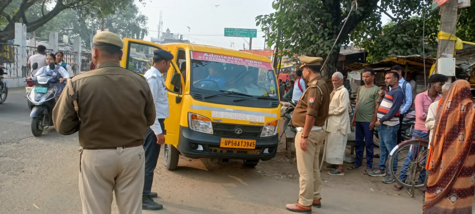 महराजगंज: यातायात माह के तहत निचलौल में स्कूली बसों की जांच, 14 वाहनों का चालान, 28,000 का जुर्माना