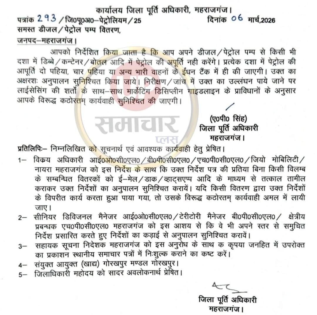 जिला पूर्ति अधिकारी ने निर्देश दिया कि कोई भी पेट्रोल पंप संचालक डब्बे, कंटेनर या बोतल में पेट्रोल अथवा डीजल की बिक्री नहीं करेगा। उन्होंने कहा कि तेल केवल वाहनों की टंकियों में ही दिया जाए। निर्देशों का उल्लंघन करने पर संबंधित पेट्रोल पंप के खिलाफ कार्रवाई की जाएगी।